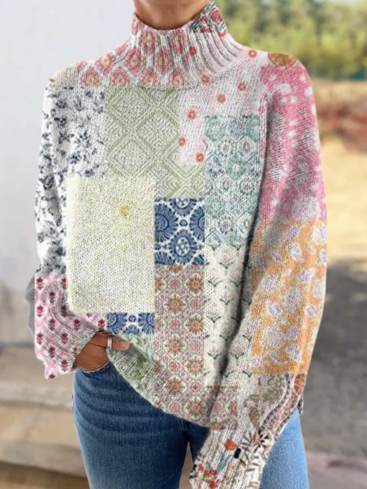 Women's Floral Panel Casual V Neck Pullover Sweater