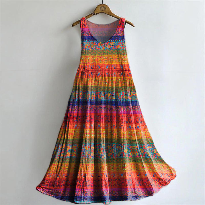 Women's Vintage Floral Art Print Sleeveless Cotton Pocket Dress